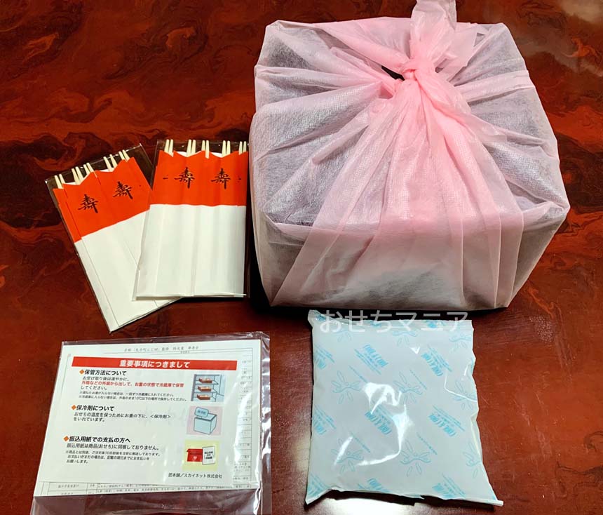 おせちは冷蔵便で届くため解凍不要。配送日は12月29日〜31日のいずれか(日時指定は不可)で、賞味期限は1月2日までです。