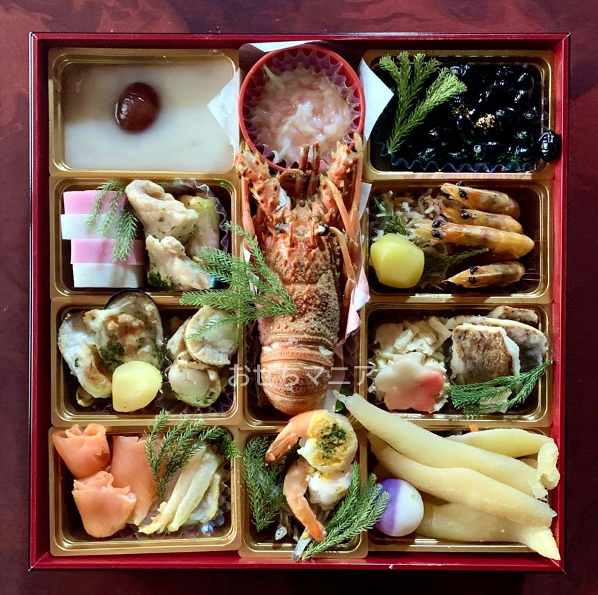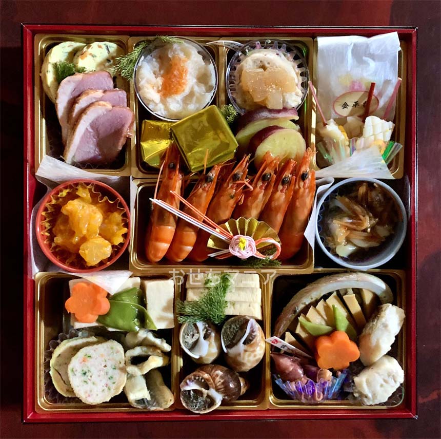 今まで購入したおせちで種類が多く満足できる品数でした。薄味で上品なお味で喜んでくれました。7人で頂きましたがほとんど残らず欲を言えば男性陣はもう少しお肉系が欲しかったようです。エビがたくさん入っていて私的には大満足です。温めて食べるとより一層美味しいものにはお品書きに印を付けてくれてたのでわかりやすく、写真で番号もつけてくれてたので品名もすぐにわかり楽しいお正月のおせちとなりました。