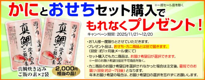 12月20日までに注文すると、鯛の炊き込みご飯の素(約2,000円相当)ももらえて、お得度はさらにUP!